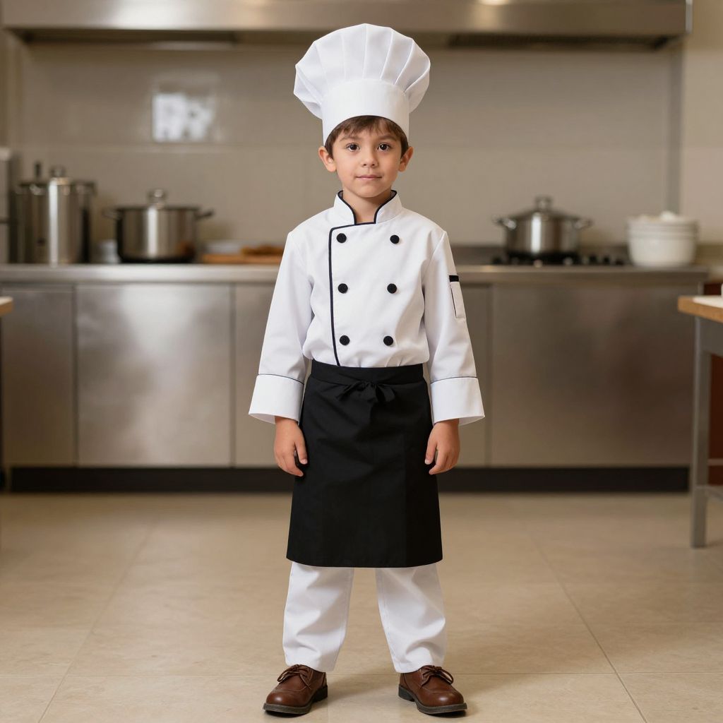 Photograph of a young Asian boy standing in a modern kitchen. He has short black hair and a fair complexion. He is dressed in a traditional white chef's uniform, including a double-breasted jacket with black buttons, black apron, white pants, and brown shoes. He also wears a tall, white chef's hat. The kitchen background has stainless steel cabinets, a countertop with several silver pots and pans, and a white tile backsplash. The floor is tiled in light beige. The boy stands centrally, looking directly at the camera with a neutral expression.