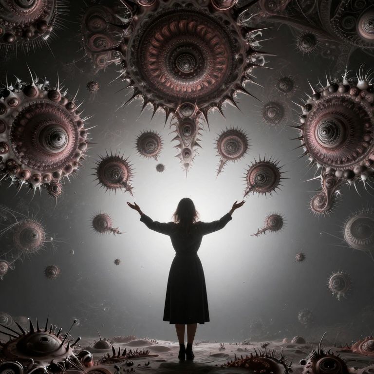 Mathematician stands defiantly beneath towering fractal forms, her outstretched arms guiding intricate patterns that emerge as tangible, spiky creatures hovering above her.