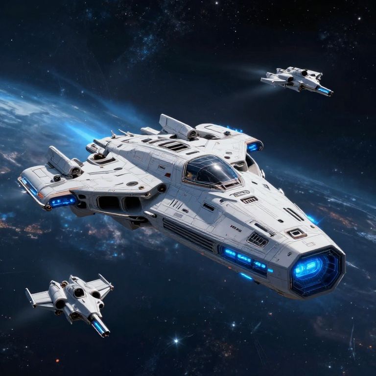 Digital artwork of a white, futuristic space battleship with blue lights, surrounded by three smaller white spacecraft, floating in a starry, cosmic background.