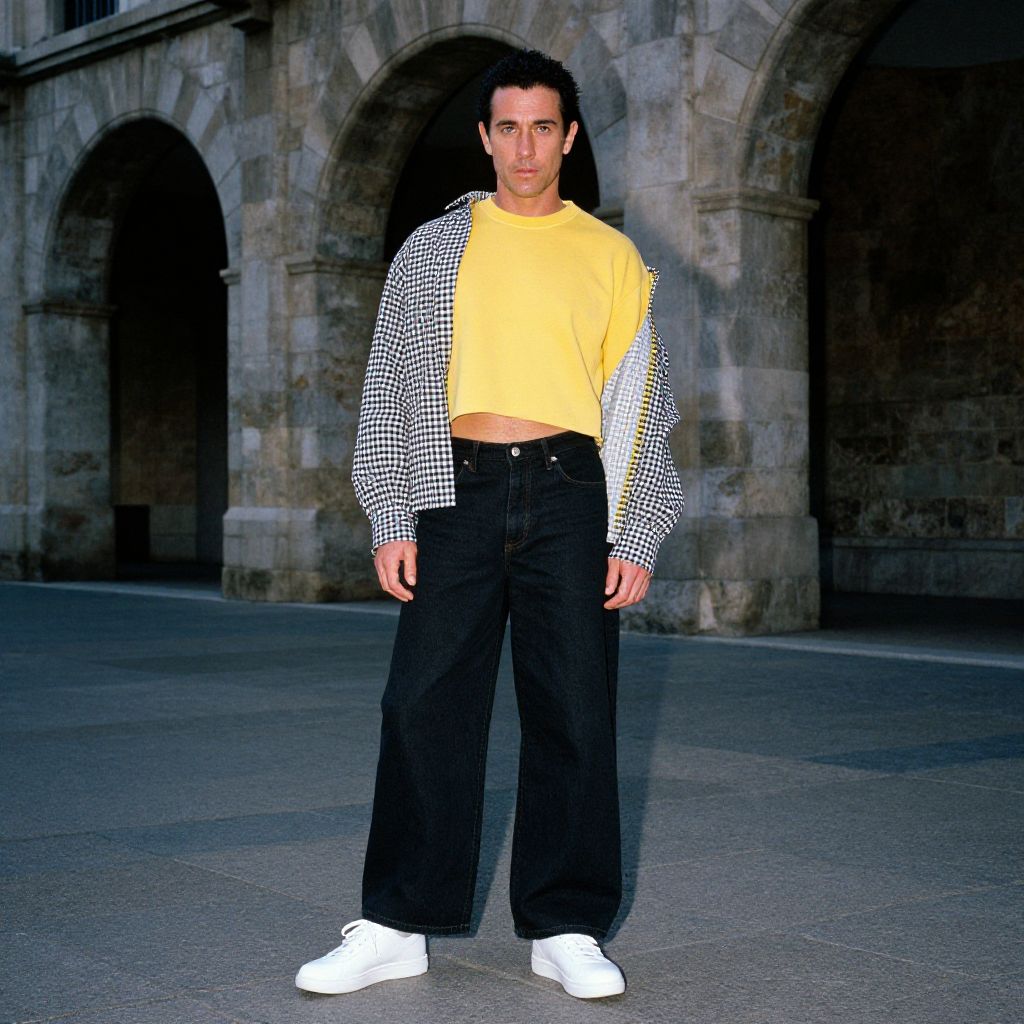 A man, wide-leg black jeans, vibrant yellow cropped sweatshirt, checkered black and white overshirt, classic white leather sneakers, historic stone arches, eastman film stock, relaxed expression, casual confidence. Man has masculine face and piercing eyes