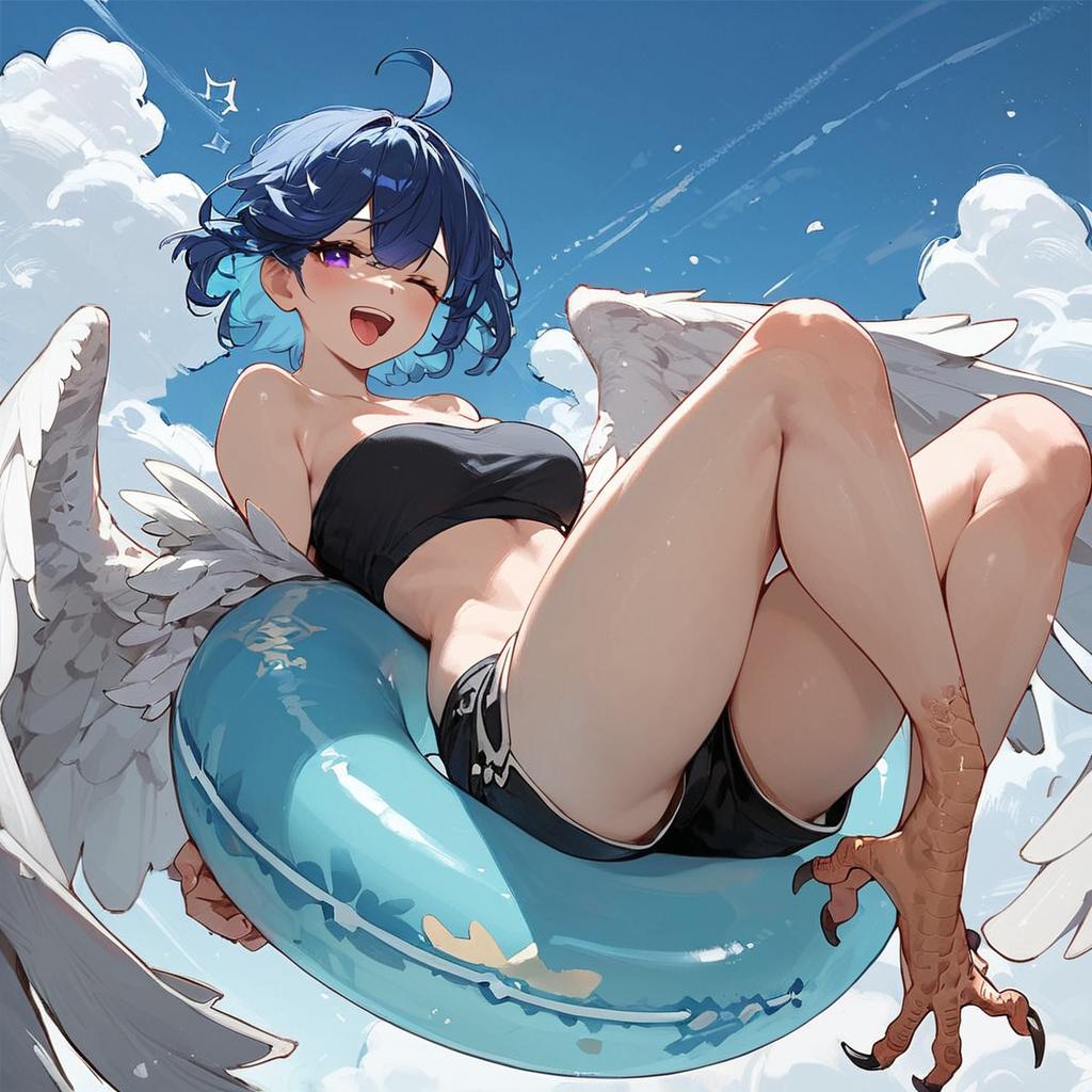 Score_9, score_8_up, score_7_up, source_anime, solo, 1girl, mmpapi, monster girl, happy, looking at viewer, flying, blue hair, ahoge, one eye closed, feathered wings, winged arms, talons, black tube top, short shorts, blue sky