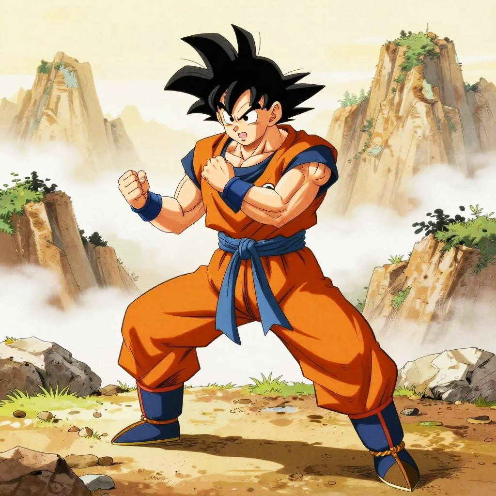 Anime-style digital drawing of angry Son Goku with glowing yellow eyes and spiky black hair, surrounded by a fiery aura, gritting teeth, and showing