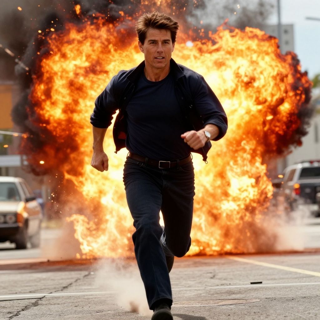 Tom Cruise running from an explosion in a Hollywood blockbuster, flames and smoke behind, adrenaline filled expression, dynamic action pose, vibrant cinematic colors