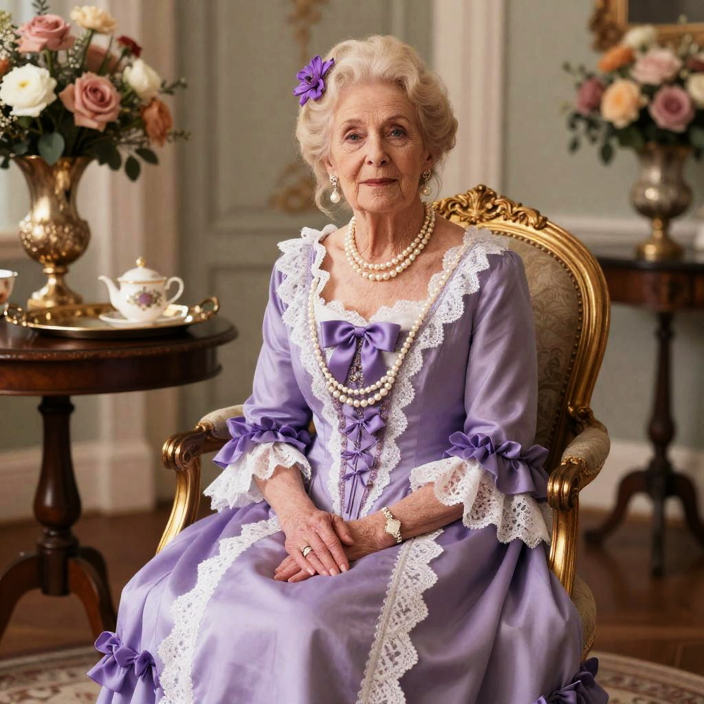 Elderly woman with blonde hair in an elaborate, Victorian-style purple dress with white lace trim and pearls, seated on an ornate gold chair. Background includes floral arrangements, a wooden table with tea set, and a side table with a tray. Her hands rest on her lap, and she wears a purple flower in her hair.