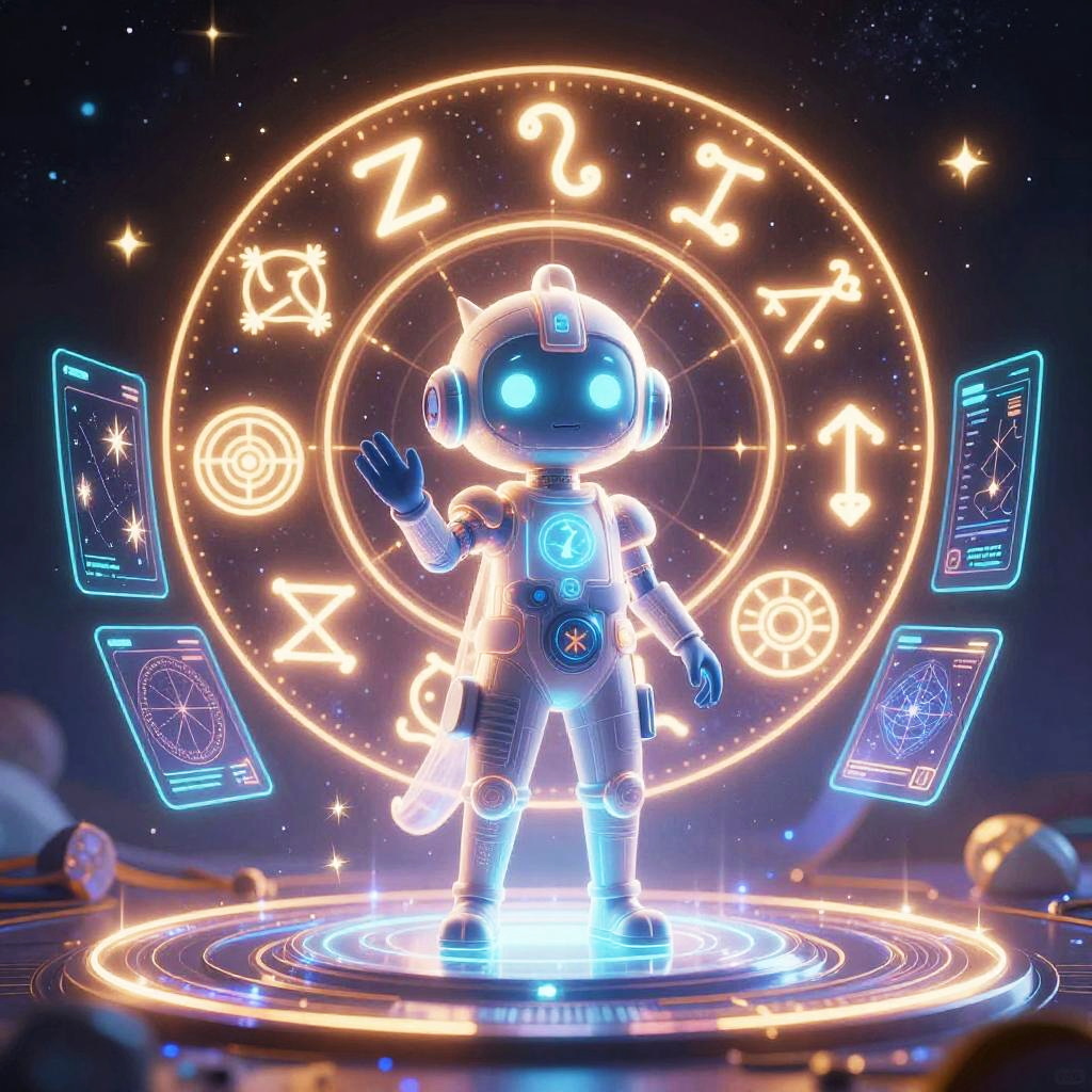 Digital CGI image of a glowing, neon-lit robot with a black, dome-shaped head and bright blue eyes, standing on a circular, illuminated platform. The robot, composed of white segments with blue accents, waves its right hand. Behind it, a large, glowing circle displays astrological symbols and neon numbers. Surrounding the circle are floating, neon-lit cards with intricate symbols and text. The background is a deep, starry space with scattered twinkling stars, adding a cosmic feel. The overall style is futuristic and cyberpunk, with vibrant neon colors and high-contrast lighting.