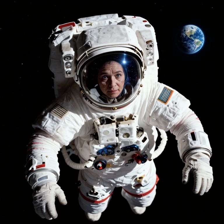 Envision a strikingly realistic portrait of an experienced astronaut floating gracefully in outer space's vast expanse, her visor mirroring the mesmerizing cosmos above. Captured from a unique 'worm's-eye view', this evocative image draws us into a serene yet awe-inspiring world beyond our planet, emphasizing the profound isolation and connection to the universe simultaneously. The astronaut's weathered features hint at time spent in space, her eyes reflecting calmness amidst boundless wonder as they gaze upon Earth suspended in the black void. This hauntingly beautiful portrait seamlessly combines high-resolution satellite photography with fine art portraiture, creating an unforgettable visual experience that transcends reality.