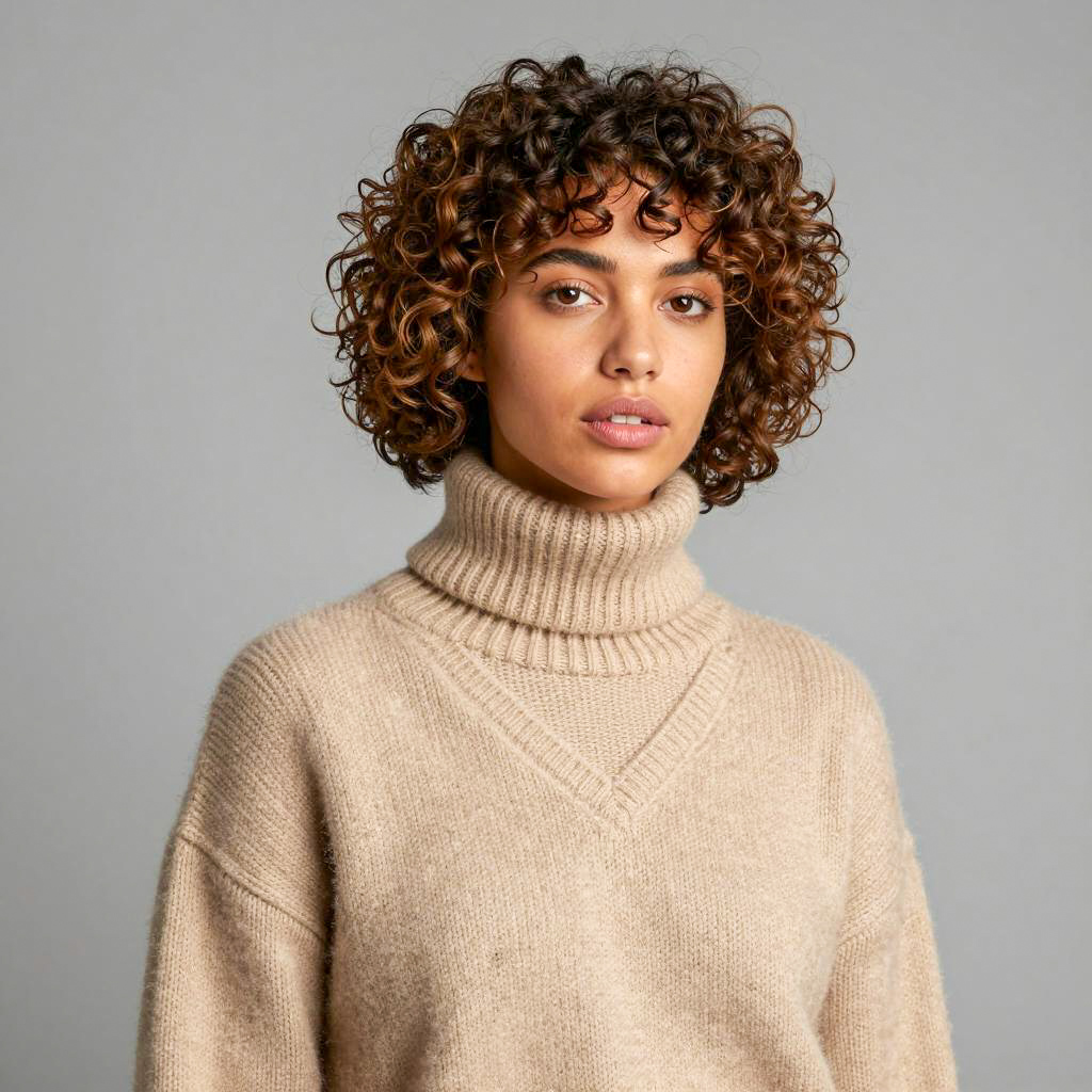 Portrait of a young woman with light brown skin and dark curly hair styled in a bun. She is wearing an off-shoulder white ruffled top and pearl earrings. The background is light gray, and the woman is looking directly at the camera with a neutral expression. The image captures an upper body medium shot in a minimalist style.