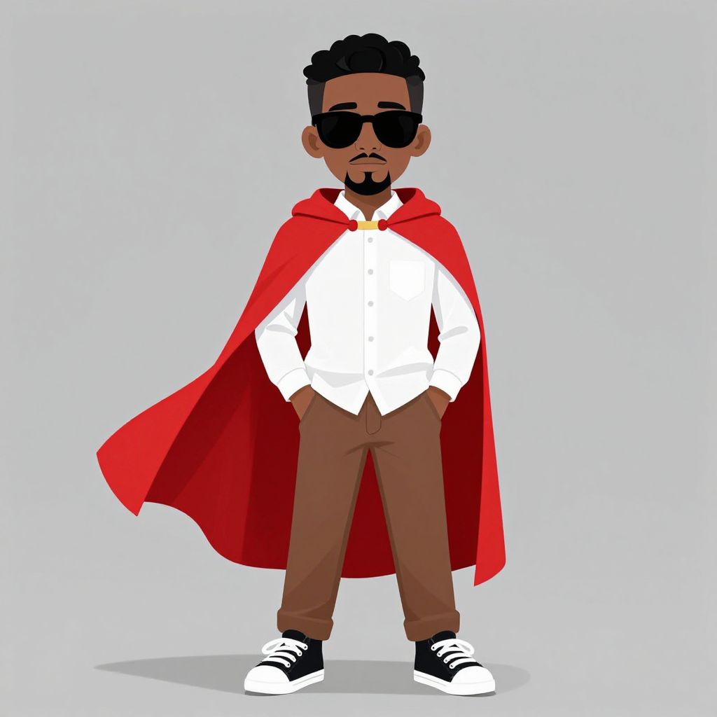 Cartoon-style drawing of a dark-skinned man with curly hair, beard, black sunglasses, white shirt, brown pants, red cape, and black
