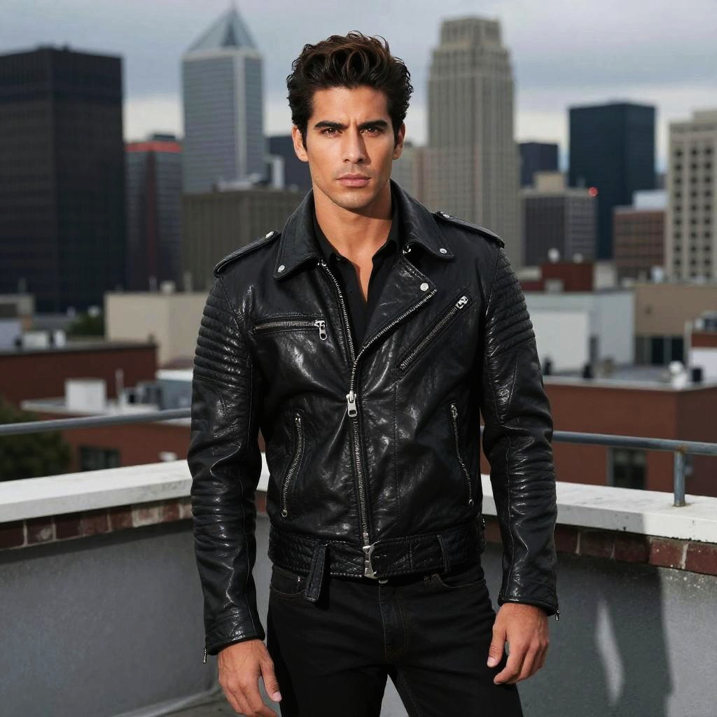 Mexican male model in a sleek leather jacket on a rooftop at dusk, city skyline behind, edgy and confident look, moody colors, urban lifestyle theme