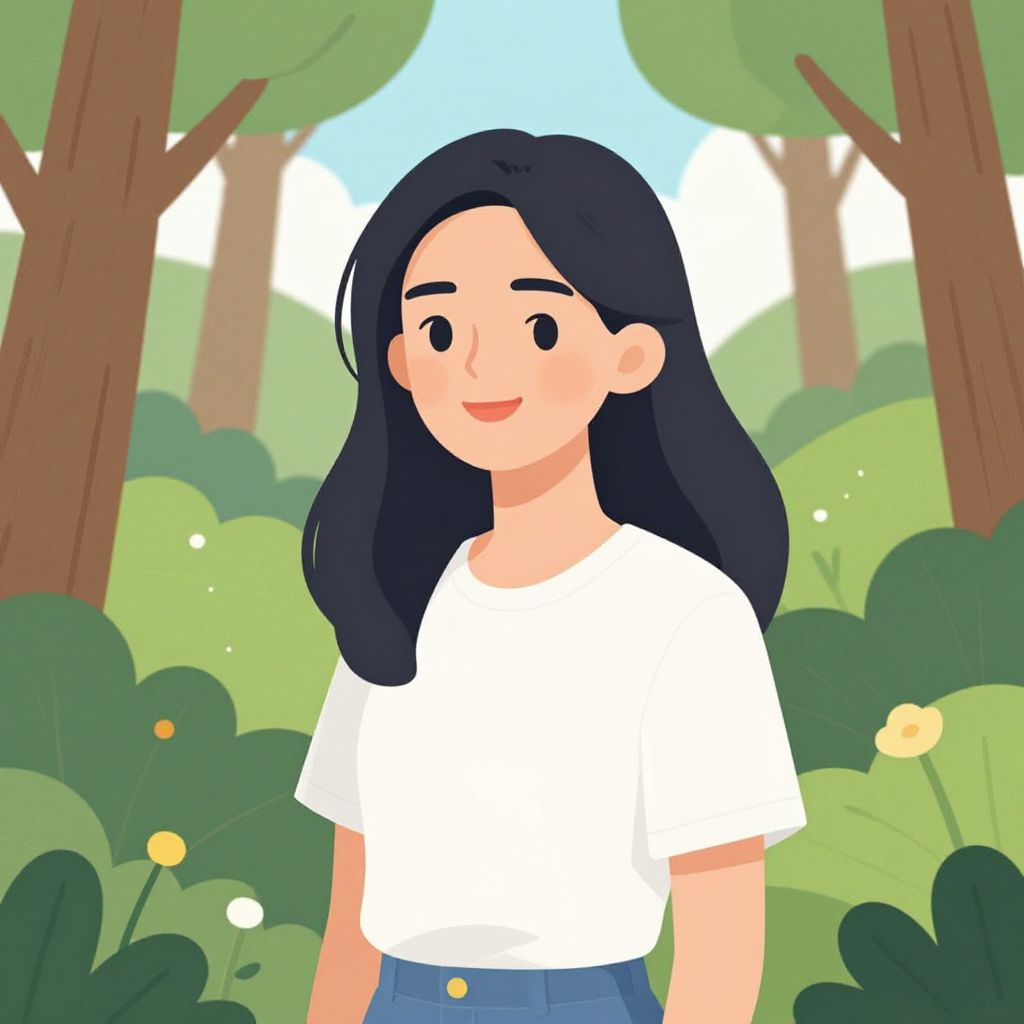 Digital drawing of a smiling young woman with long black hair, wearing a green dress over a white shirt, in a sunny, green countryside with trees and