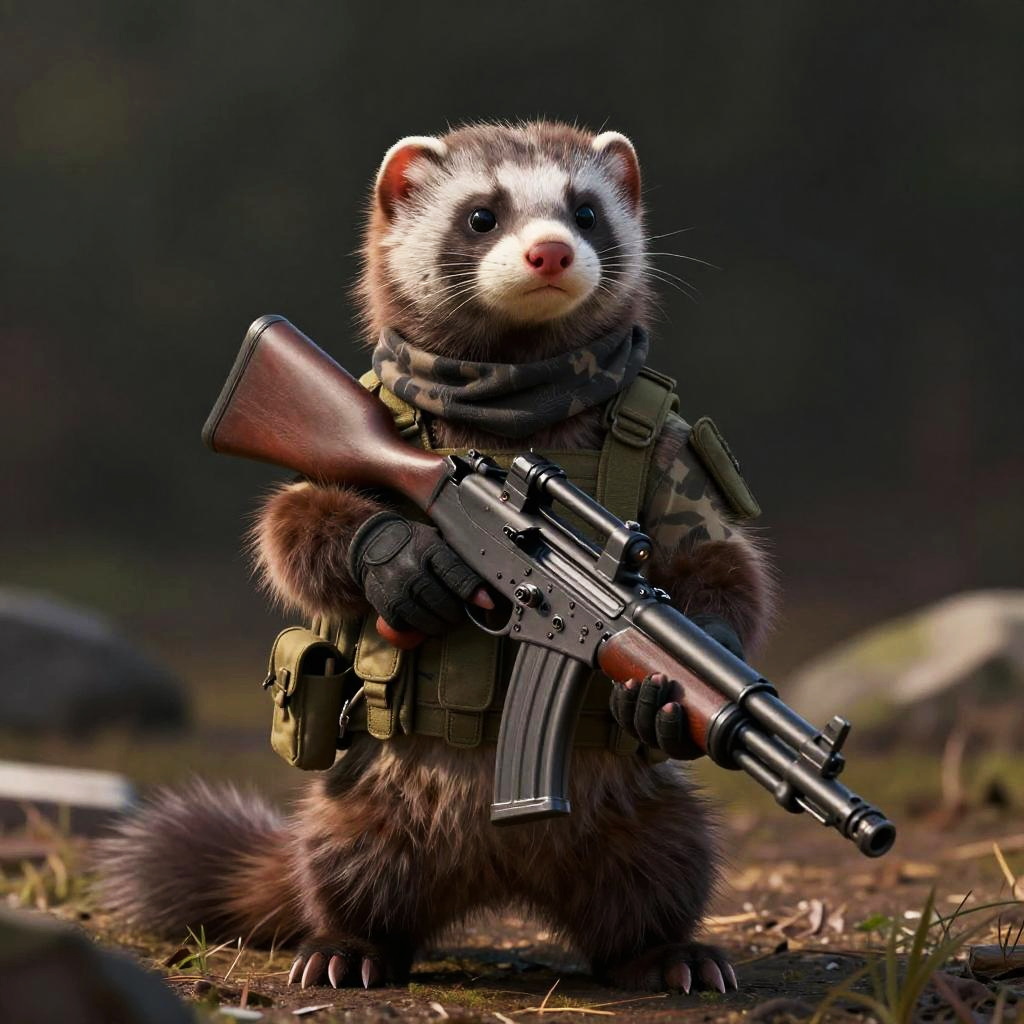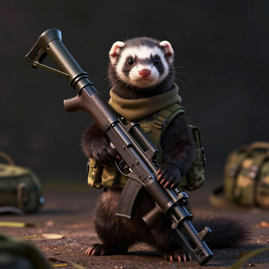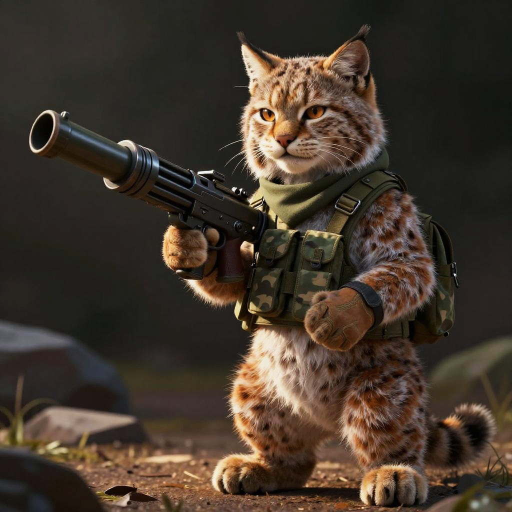 Absurdres, (realistic:1.5), (masterpiece, Extremely detailed CG unity 8k wallpaper, best quality, highres:1.2), (ultra_detailed, UHD:1.2), perfect illumination, unreal engine, sidelighting, (dark background:1.4), (cougar:1.2), (american cougar:1.2), (no humans:1.2), (furry:1.1), animal focus, animal, solo, standing, weapon, gun, (rocket launcher:1.4), rpg, gloves, holding, holding weapon, holding gun, military, whiskers, load bearing vest, pouch, holster, camouflage, bag, scarf, blurry background