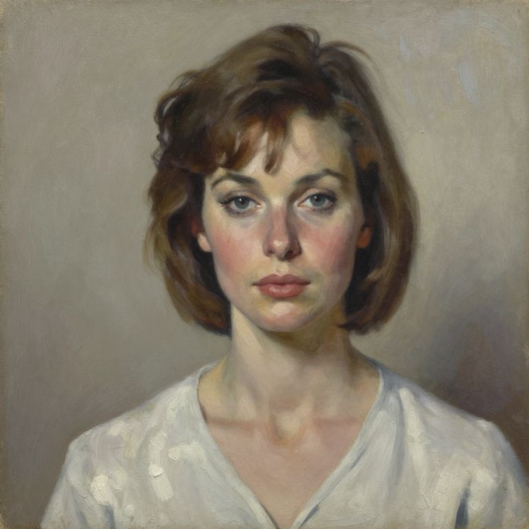 This is a digital painting in a realistic style depicting a young woman with a fair complexion and short, wavy brown hair. She has blue eyes, a slightly upturned nose, and full, pink lips. She wears a simple, white, V-neck shirt. The background is a muted, grayish-brown gradient, which subtly contrasts with her pale skin and white clothing. The artist uses soft, blended brushstrokes to create a smooth texture, emphasizing the natural light and shadows on her face and upper body. Her expression is neutral, with a slight, introspective gaze directed at the viewer.