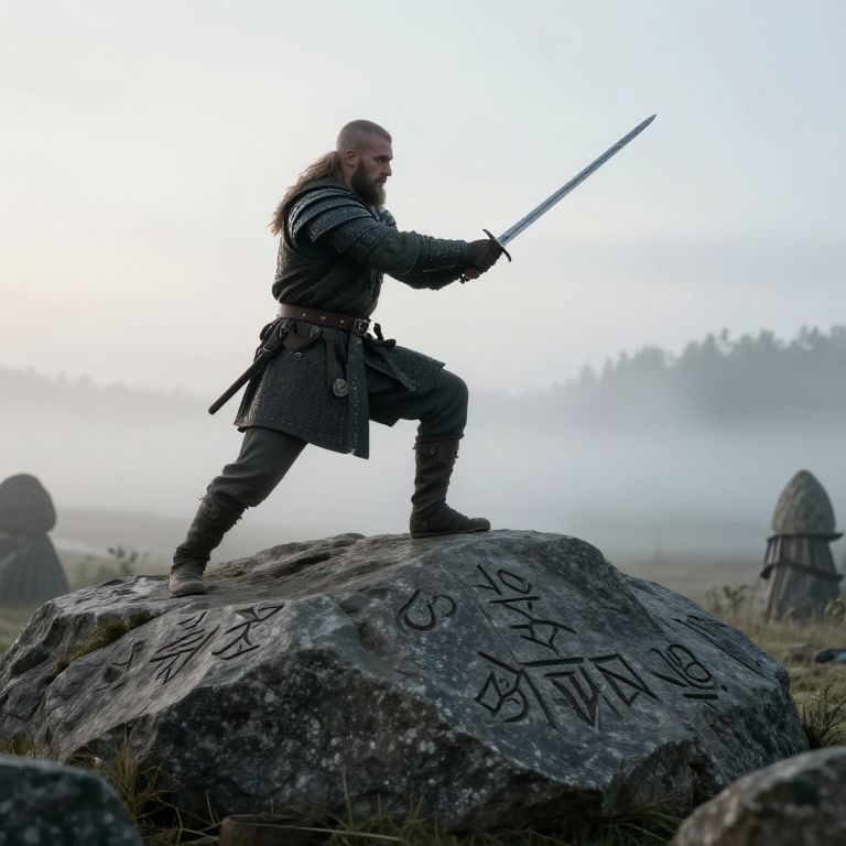 Vikings prompt: A Viking warrior practicing swordsmanship on a stone training mound, surrounded by ancient runes carved into the ground, early morning mist, detailed armor and environment, historical realism.