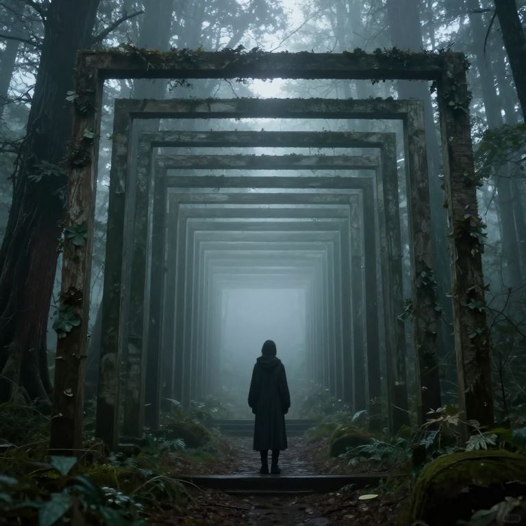 Photograph of a woman in a bright red coat standing alone in a misty, dark forest, facing a cloudy, moonlit sky.
