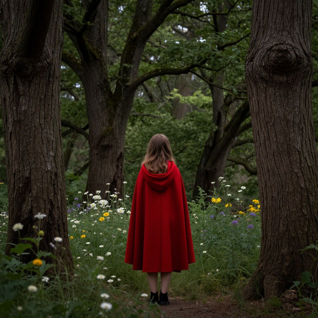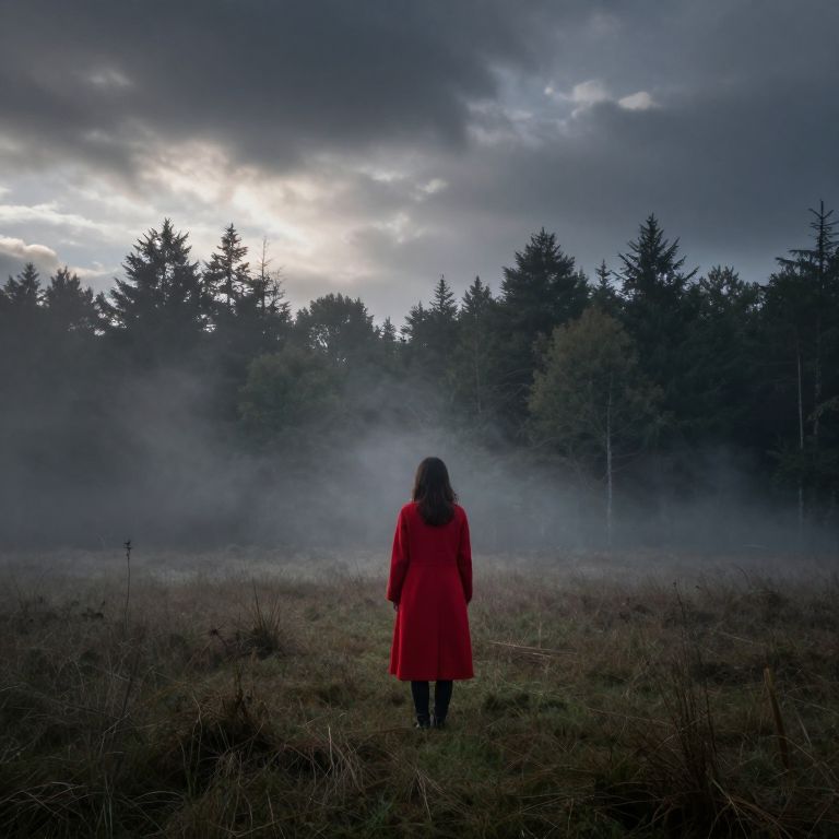 A photograph of a woman standing in a misty forest at dusk. She faces away from the camera, wearing a vibrant red coat that contrasts with the dark, moody background. Her dark hair falls to her shoulders. The forest is dense with tall, shadowy pine trees, and the sky above is overcast with heavy clouds, allowing a faint, diffused light to peek through. A thick mist hovers near the ground, adding a mysterious atmosphere. The ground is grassy and slightly damp, with sparse, brown, dry grasses in the foreground.
