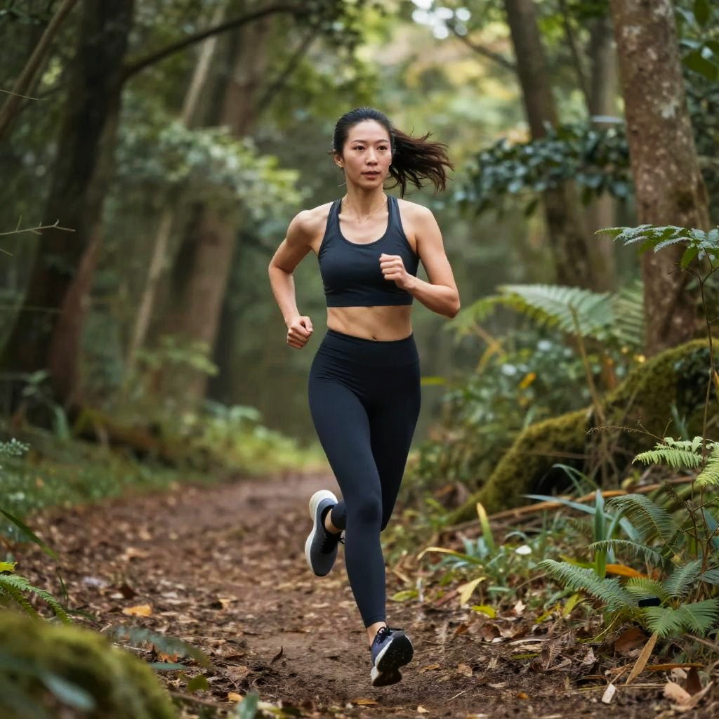 Energetic Woman Running Forest Trail
