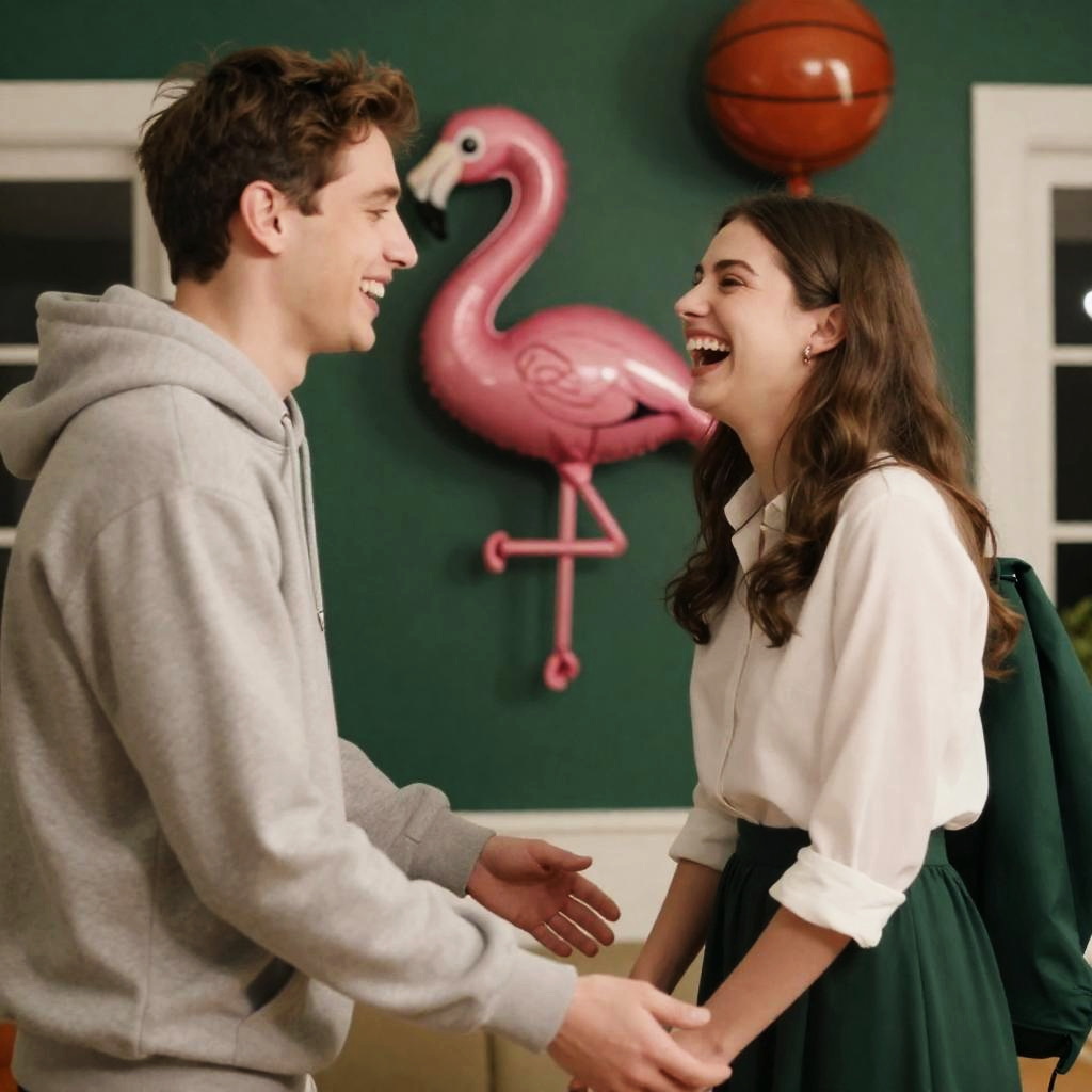 Two people in a room, man in gray hoodie and woman in white shirt and green dress, laughing, man reaching out. Pink flamingo balloon and basketball-shaped decoration on green wall. Woman's long brown hair, man's short brown hair. Green coat on back. Warm indoor lighting.