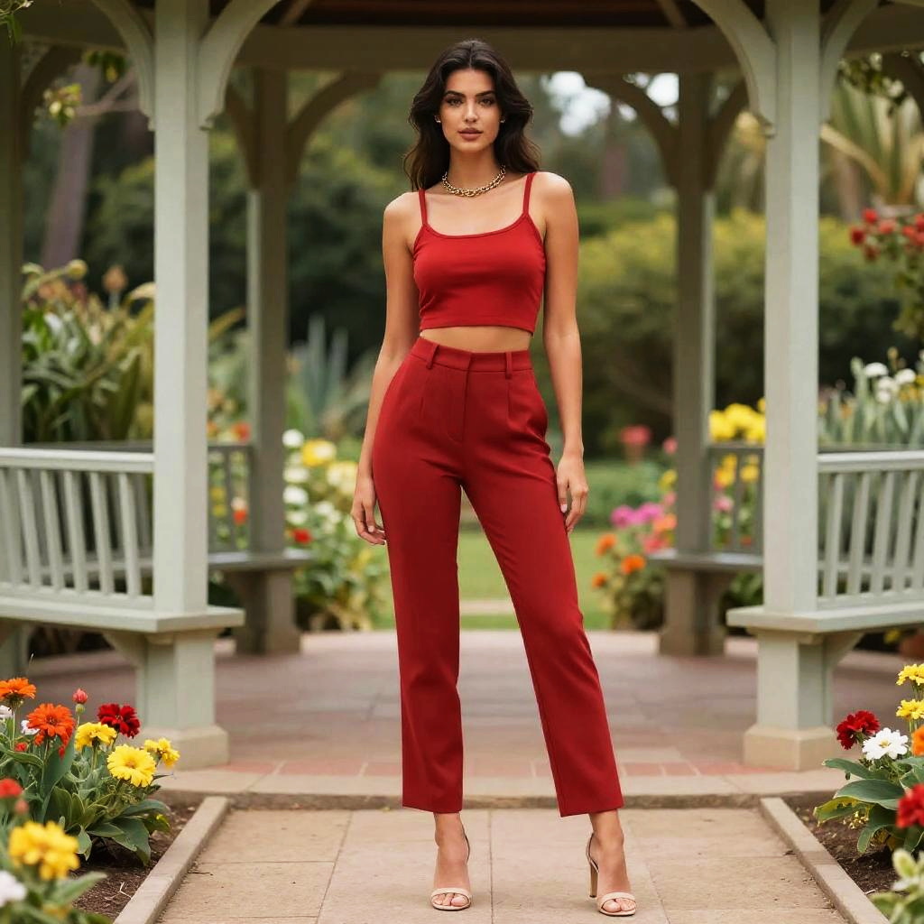 A woman in a minimalist, tailored deep red pantsuit with a slim fit, single-breasted blazer and straight-leg trousers, paired with a cropped nude tank top and barefoot, hoop earrings, hair pulled back, enjoying a candlelit dinner in a treehouse. Sexy. Pretty face and beutiful eyes