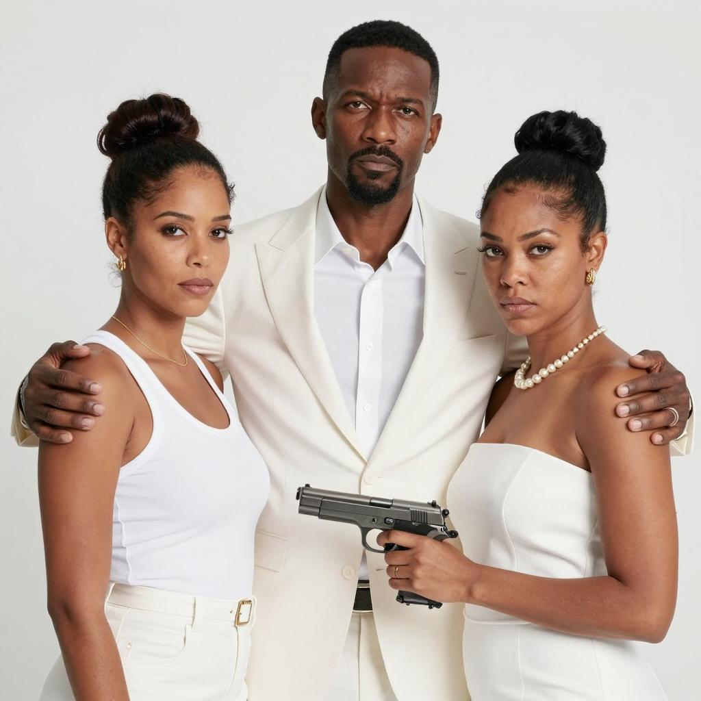 A photograph of a black man with a mustache, short hair, and a black vest over a button-up shirt, holding a handgun with his right hand. He stands in front of a gradient sky with palm trees in the background.