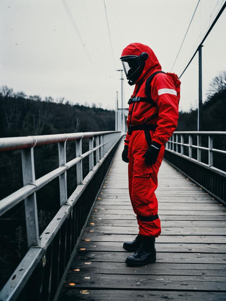 Red Blow Suit, man in a red suit standing on a bridge