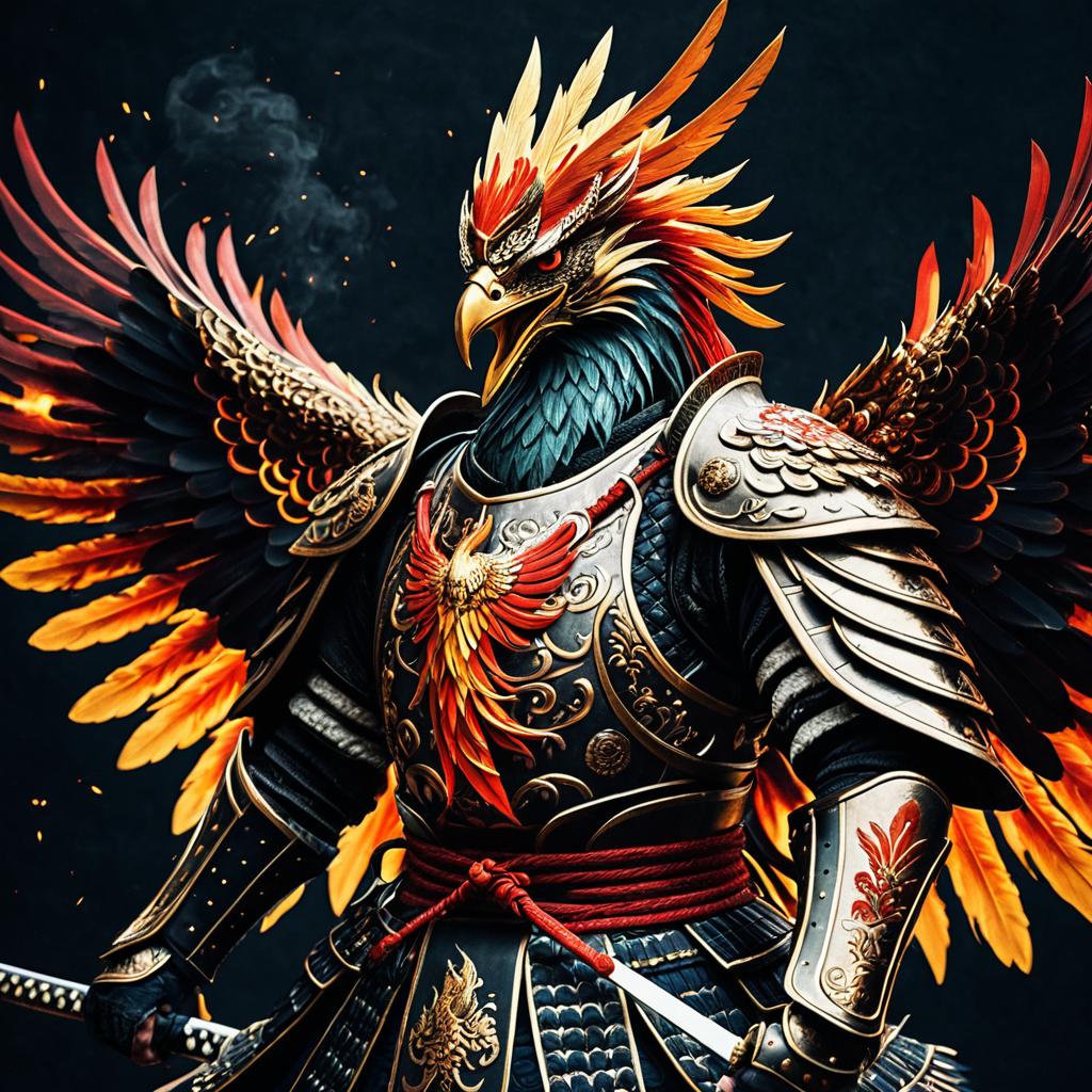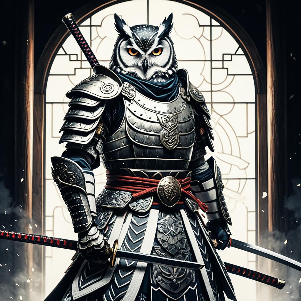 Full body portrait of an anime owl shaman, wearing traditional samurai armor, enchanted atmosphere, soft lighting, intricate details, flowing lines, art nouveau influence, ghostwhite color tone