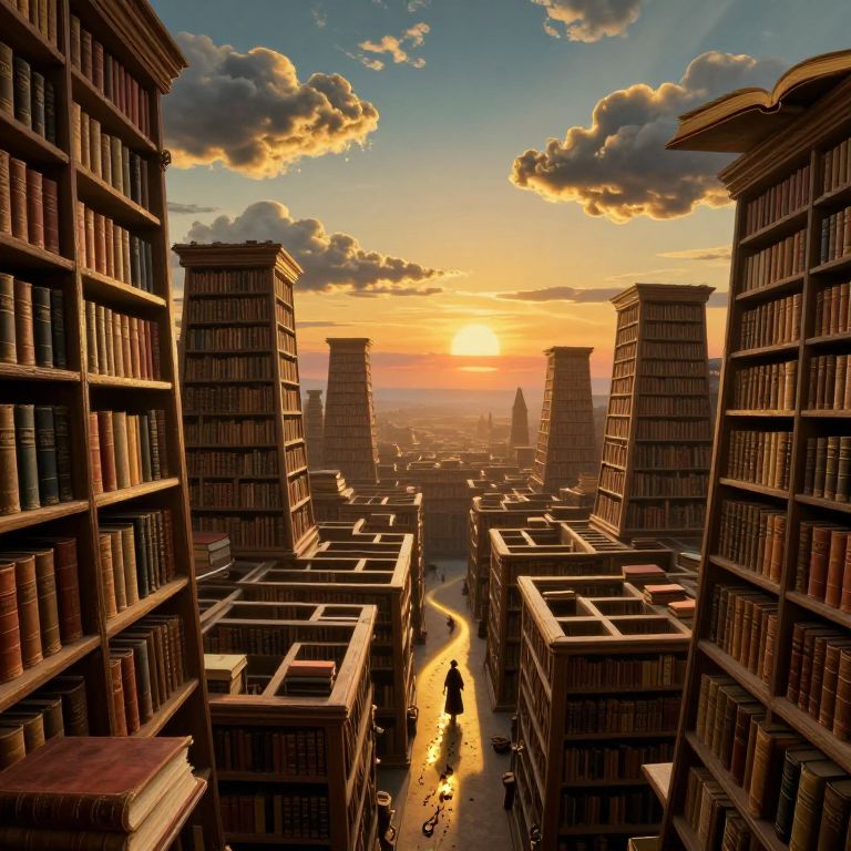 Digital artwork depicts a towering cityscape of book-filled, rectangular buildings at sunset. The sky is ablaze with orange and yellow hues, contrasting with dark, fluffy clouds. Two central buildings frame a narrow, sunlit street below, where tiny figures walk. The buildings' exteriors are uniformly covered in books, creating a textured, grid-like pattern. In the distance, more book-filled structures extend towards a glowing horizon. The overall style is hyper-realistic with a fantastical twist, emphasizing the surreal, towering library city. The scene evokes a sense of grandeur and wonder.