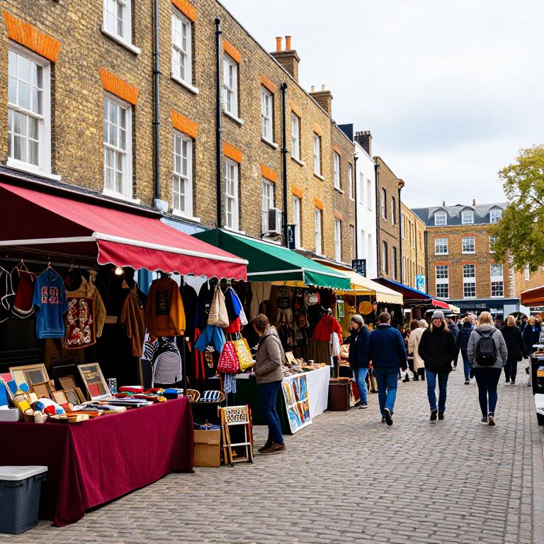 Vibrant stalls line the cobblestone path of Brick Lane Vintage Market in London, England, featuring colorful awnings, vintage goods, and bustling crowds exploring the eclectic offerings beneath historic brick buildings.