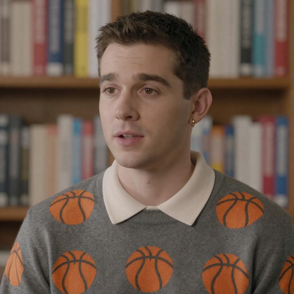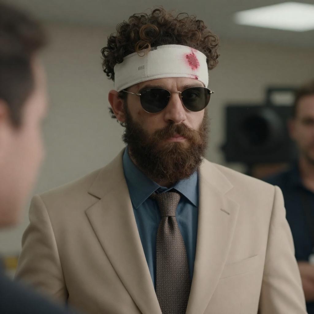 Photograph of a bearded man with curly hair, wearing a beige suit, blue shirt, patterned tie, and dark sunglasses. He has a white bandage with a red stain on his forehead. Background is an indoor setting with blurred equipment. Another person's partial face is visible on the left. Man has a serious expression.