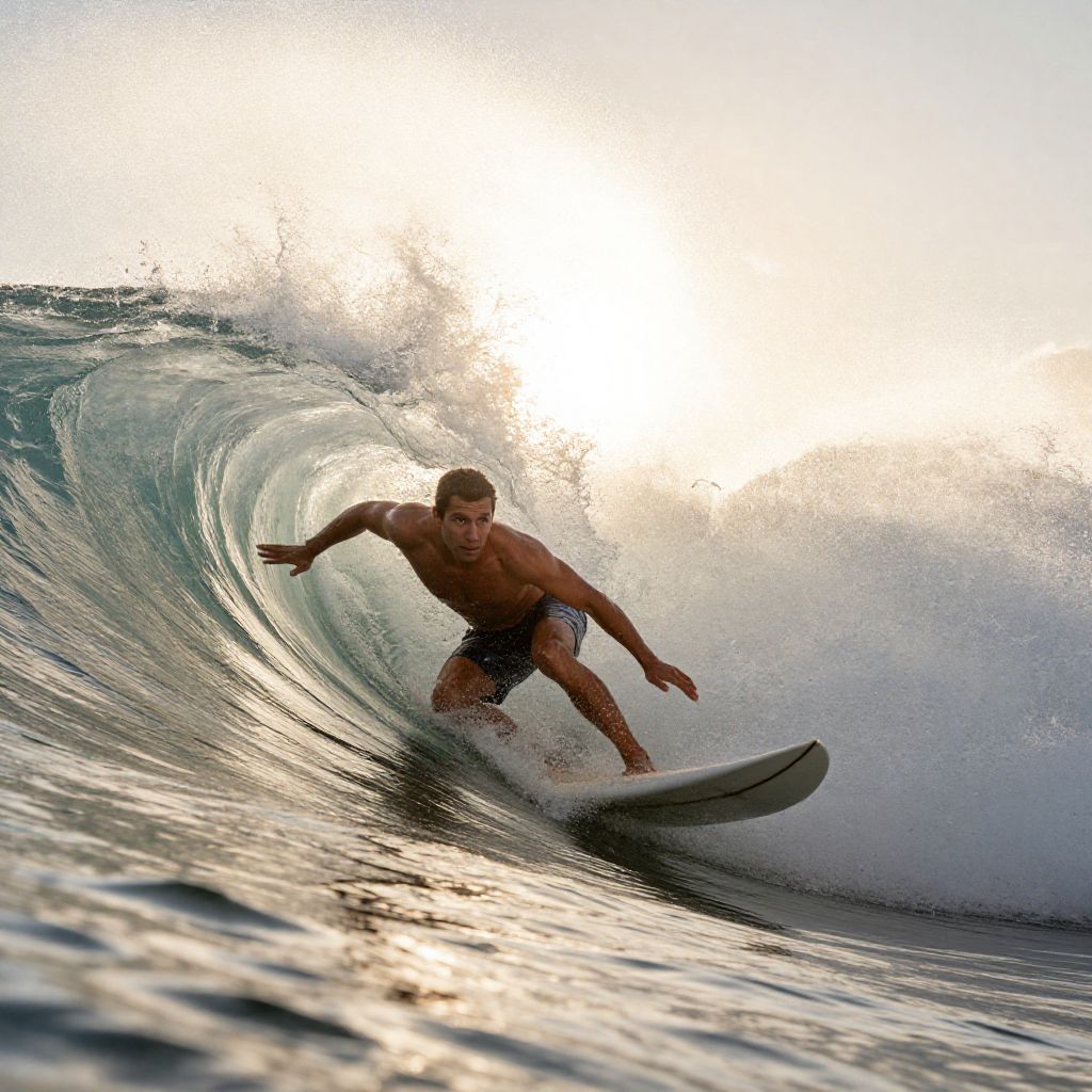 Captivating scene: A surfer riding an enormous wave, illuminated by intense volumetric lighting, showcasing his agility, determination, and connection with nature. Ocean's power, movement, foam, spray, mist, sunburst, golden hour, dramatic composition, shallow depth of field, vivid colors, dynamic motion, energy, thrill, adventure, awe Man has masculine face and piercing eyes