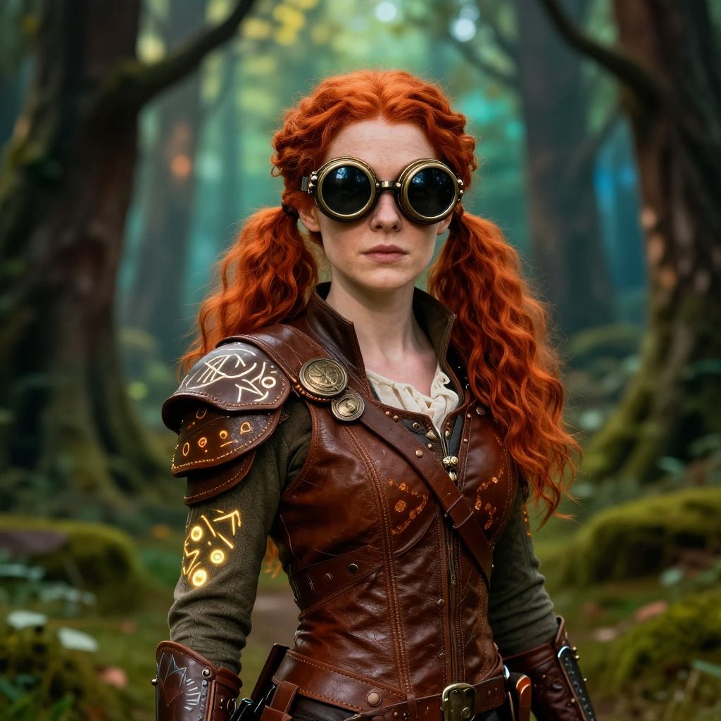 Redhead pigtails character standing in a vibrant fantasy forest, wearing steampunk goggles and leather armor, intricate details, glowing magical runes, cinematic lighting