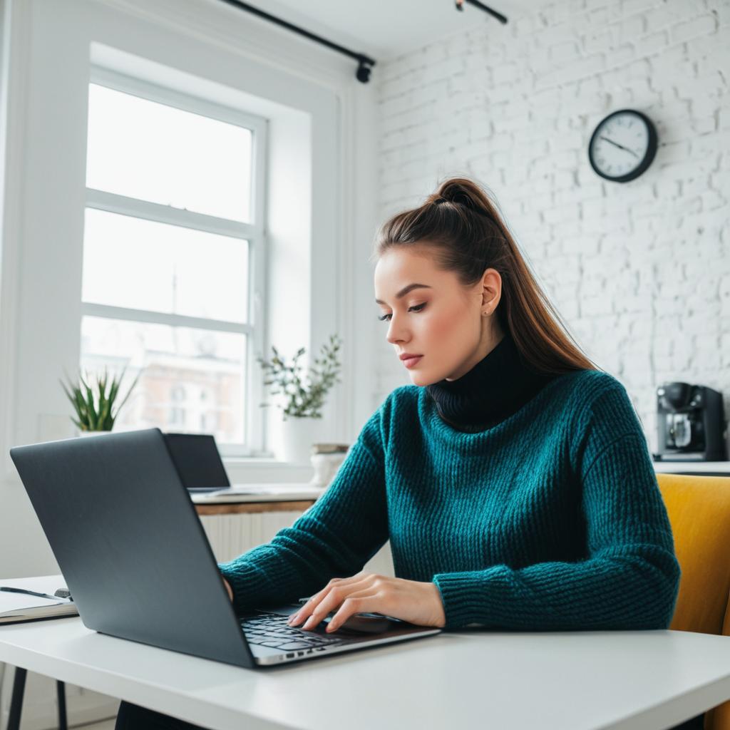 Wide-angle dynamic range, a gorgeous and stunning real face of a enthusiastic Mexican female software developer, working on a laptop, wearing colorful scarf and blouse, in a bright home office with white walls. Rendered in the style of professional stock photography, shot on 70mm, balanced warm and cool lighting, 8k resolution, pastel aqua and pastel goldenrod accents, white tones.