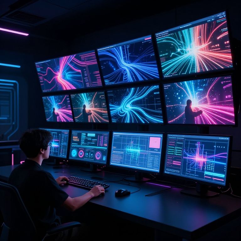 Photograph of a young man with short dark hair sitting at a black desk in a dimly lit room. He wears a black shirt and focuses on multiple computer monitors displaying vibrant neon blue, pink, and white digital patterns resembling cosmic bursts and circuitry. The background features a wall of six larger screens displaying similar neon patterns. The room is illuminated by purple and blue neon lights, creating a futuristic, cyber-tech atmosphere. The man's right hand rests on a mouse, and his left hand is on a keyboard.