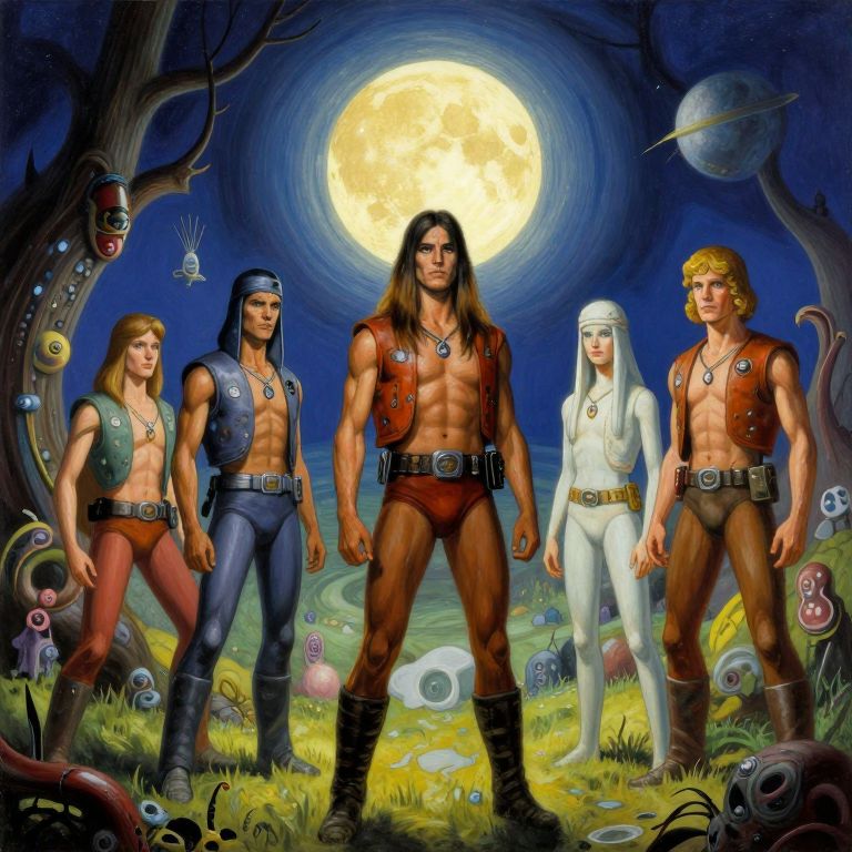 Digital artwork of five muscular, shirtless warriors in tight pants, standing under a full moon in a surreal forest with glowing mushrooms and planets. Central figure