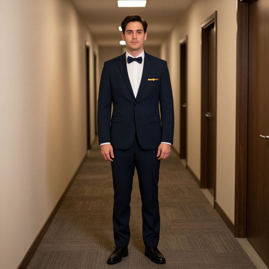 Movie Theater Usher Costume, man in a suit standing in a hallway