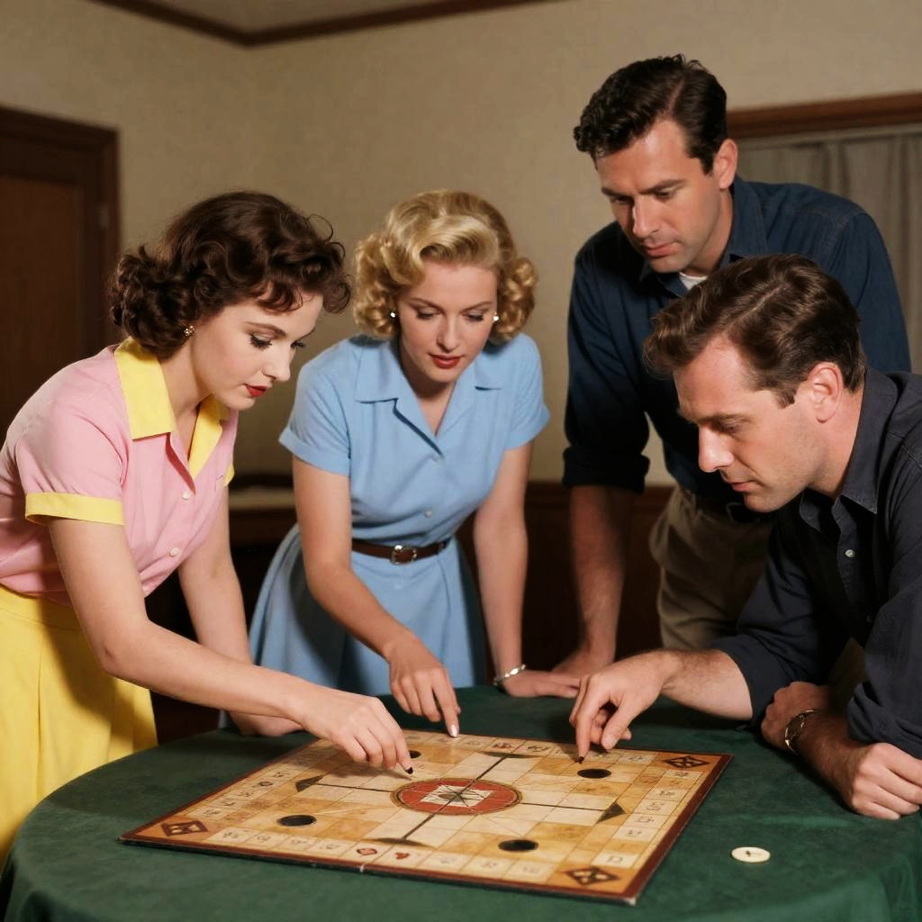 Vintage illustration of a group of men playing poker at a table, focused on the game. 15 men, diverse ages, wearing suits and hats, intense expressions. One woman in a dress on the right, standing, arms crossed, looking down. Green poker table, chips, cards. Bright, colorful, mid-20th-century style. Iconic "40 Bounds of Trouble" graphic in the top center.