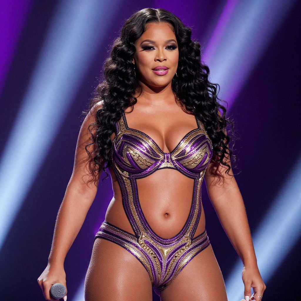 Photograph of a curvy woman with medium brown skin and long, curly black hair, standing on a stage with purple and white lights in the background. She's holding a microphone in her right hand and wearing a shimmering purple and gold bodysuit with intricate patterns, revealing her large breasts and toned midriff. She has a confident expression and is wearing bold makeup, including dark eyeliner and pink lipstick.