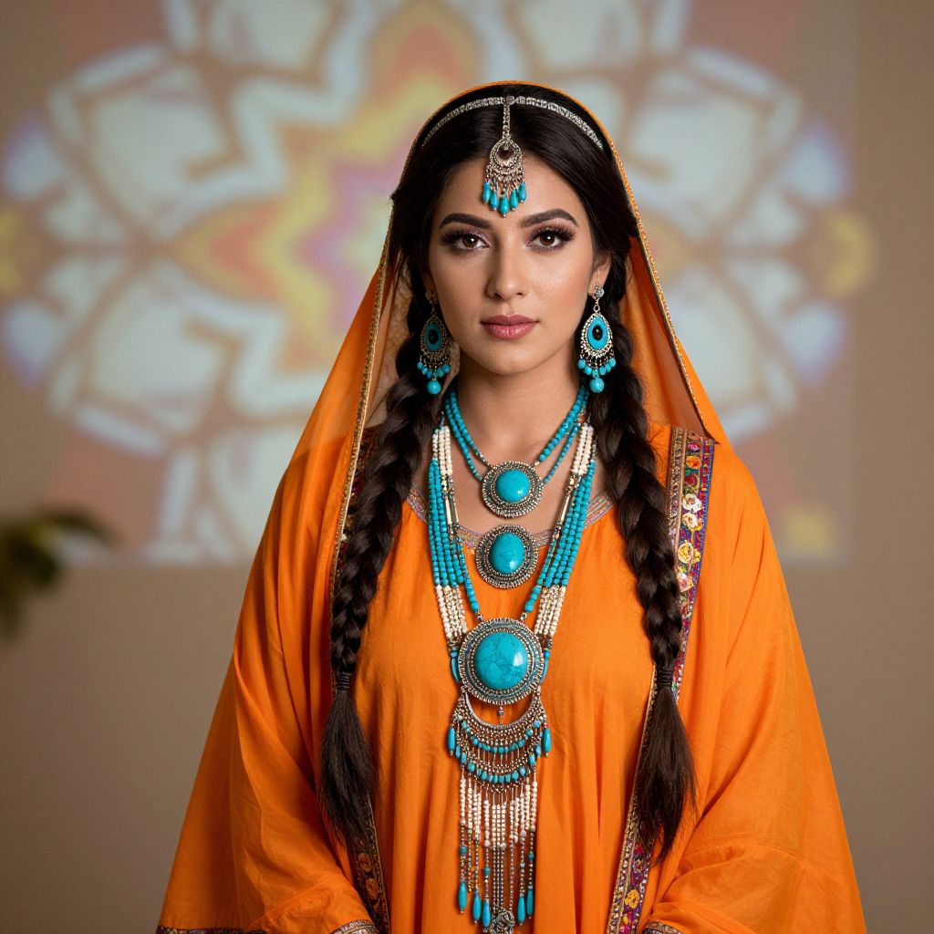 Vibrant portrait of a woman in traditional attire, featuring flowing orange garments, intricate turquoise jewelry, and layered accessories, set against a softly blurred background with projected patterns.