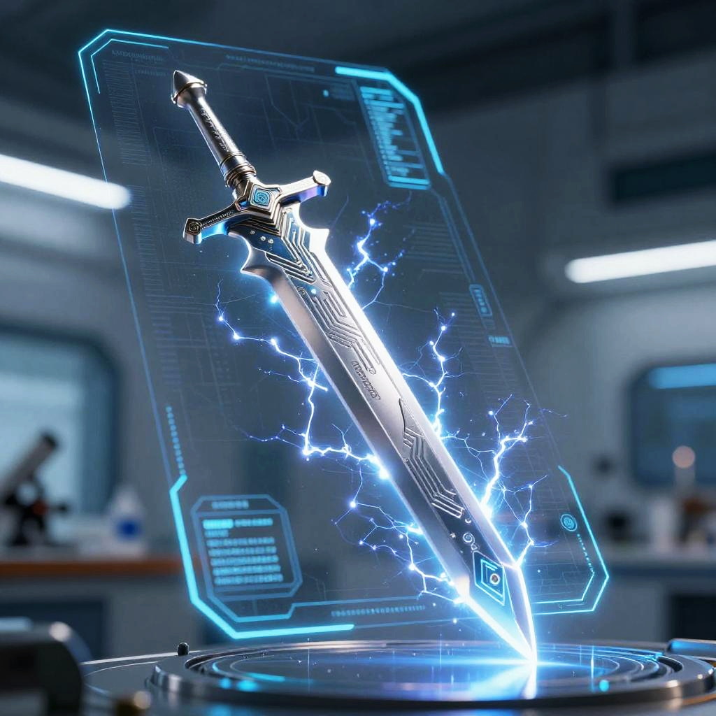 Energy sci fi sword emitting crackling plasma, sleek silver blade with intricate circuitry patterns, floating in a holographic display, futuristic laboratory setting, ultra-realistic style