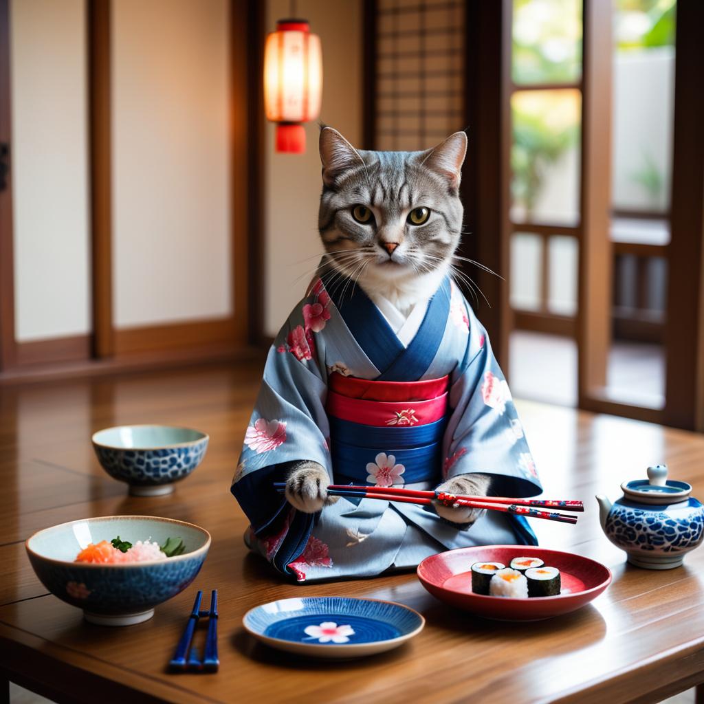 A realistic, detailed image of a gray tabby cat dressed in a traditional blue kimono with red and pink floral patterns, holding chopsticks while sitting at a wooden table. In front of the cat is a plate with assorted sushi and a bowl of rice, set in a softly lit, traditional Japanese interior with sliding paper doors and natural warm light creating a calm, cinematic atmosphere