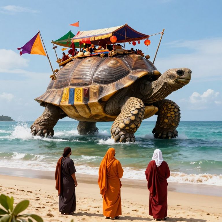 A vibrant photograph of a large, decorated turtle with a wooden platform and colorful flags on its back, standing in the shallow ocean. Three robed monks, one in orange, one in white, and one in brown, stand on the sandy beach facing the turtle. The clear blue sky and gentle waves enhance the tropical setting. The turtle's shell is adorned with intricate patterns and yellow symbols, adding cultural and artistic elements to the scene.