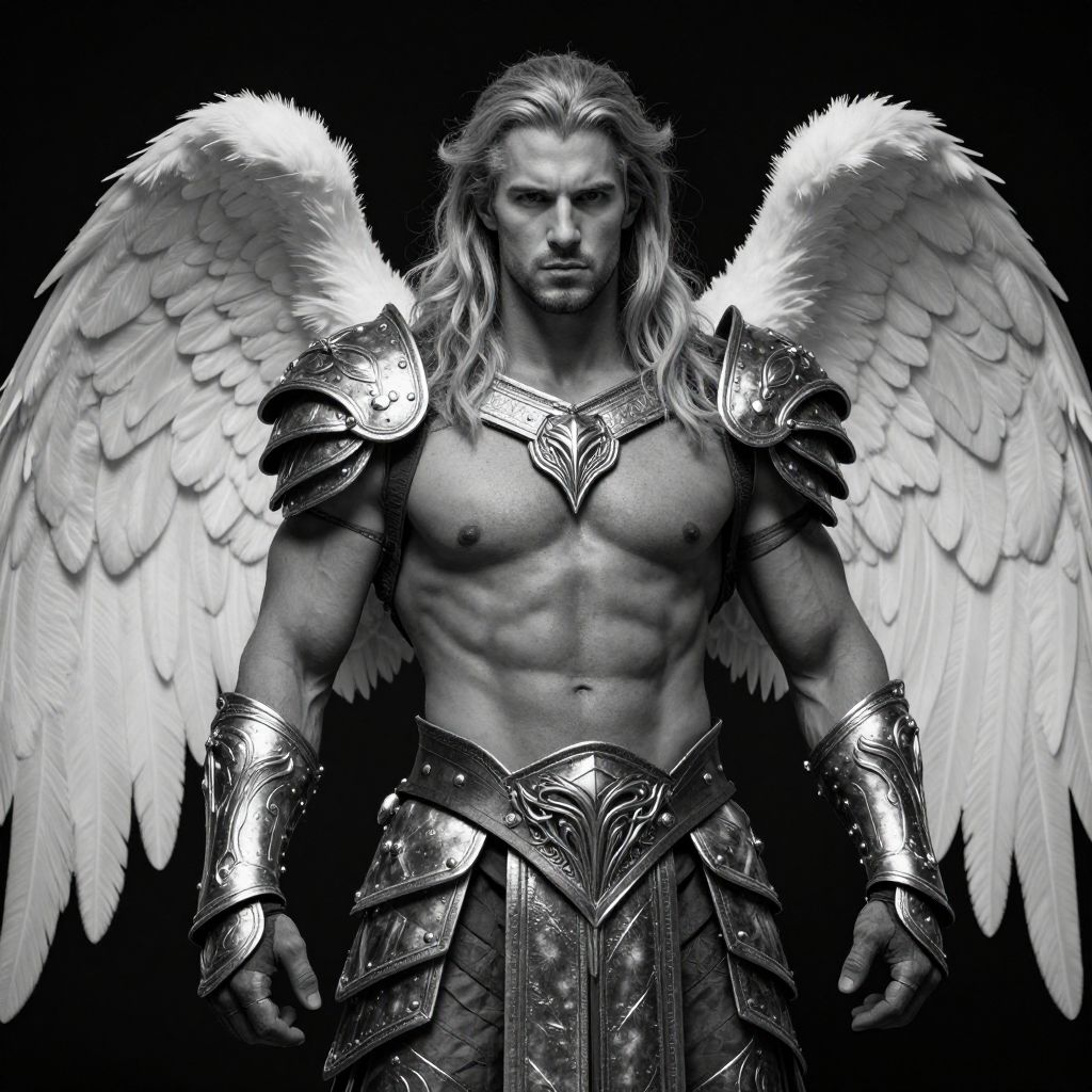 A muscular man with long blonde hair and angel wings, wearing ornate armor, stands in a black and white image.