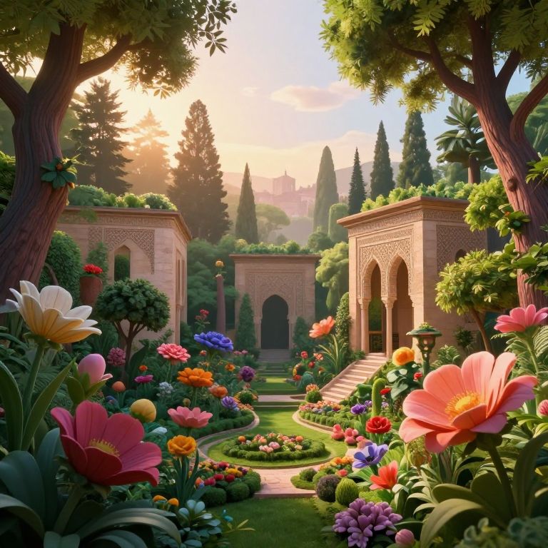 A captivating digital artwork unveils an enchanting surrealist garden viewed from a mystical 'dragon's-eye perspective'. The verdant landscape is populated by oversized flowers and towering trees, their vivid colors blending in soft, dreamlike shades. Majestic stone edifices, adorned with intricate geometric patterns reminiscent of Alhambra, stand tall amidst the lush foliage. Their silhouettes are softened by the warm glow of the setting sun filtering through the dense canopy above. This mesmerizing tableau evokes a sense of wonder and tranquility, inviting viewers to immerse themselves in the serene beauty of this unique fusion of nature and architecture that transcends time and space.