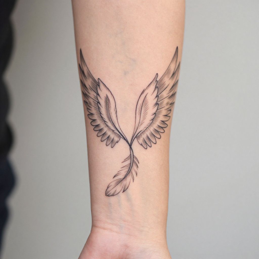 Wings tattoo on arm, stylized minimalist design with fine line art, elegant and slender feathers, wrapping delicately around the wrist and extending upwards, subtle negative space usage, soft skin tone background enhancing the simplicity.