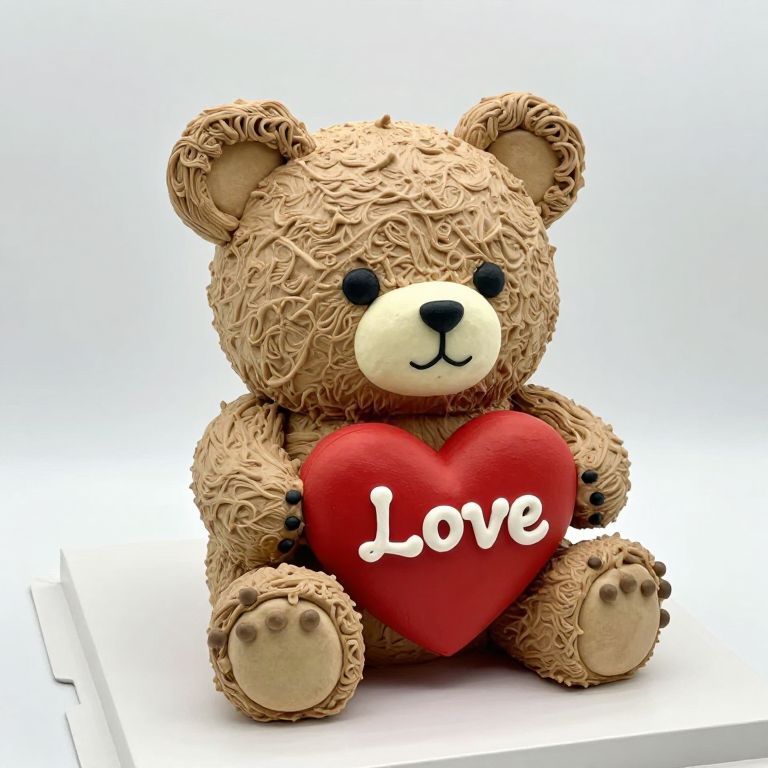 A whimsical 3D sculpted cake crafted to resemble a lifelike teddy bear cradling a vibrant red heart emblazoned with the word \"Love,\" defying the boundaries between edible art and tangible reality.