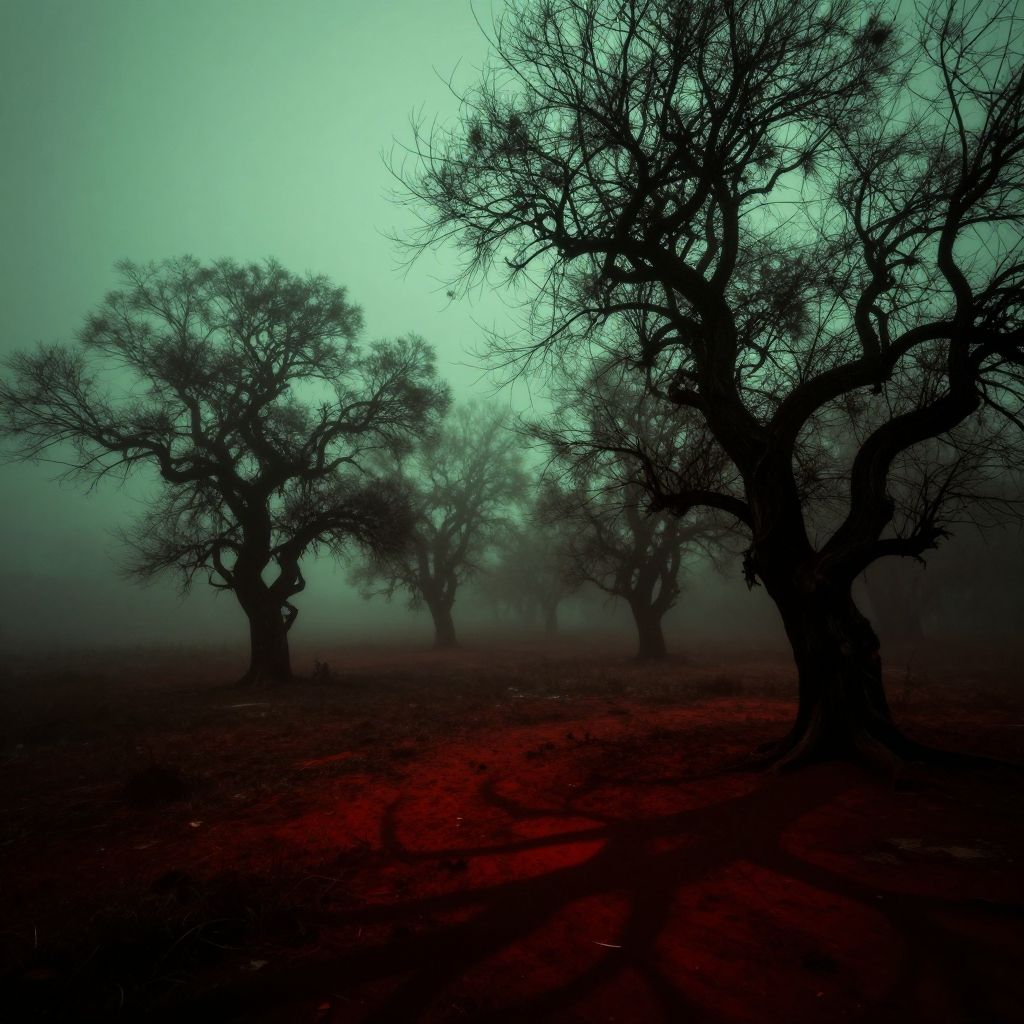 This photograph captures a foggy, eerie landscape featuring several leafless, gnarled trees with twisted branches silhouetted against a hazy, greenish sky. The ground is a dark, reddish-brown, almost black, with faint, indistinct marks suggesting moisture or shadow. The trees are scattered across the scene, with one prominently in the foreground and others fading into the misty background. The overall mood is haunting and mysterious, with the fog adding a sense of depth and isolation. The image has a high contrast between the dark trees and the lighter sky, enhancing the silhouette effect.