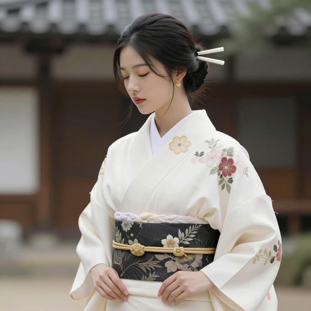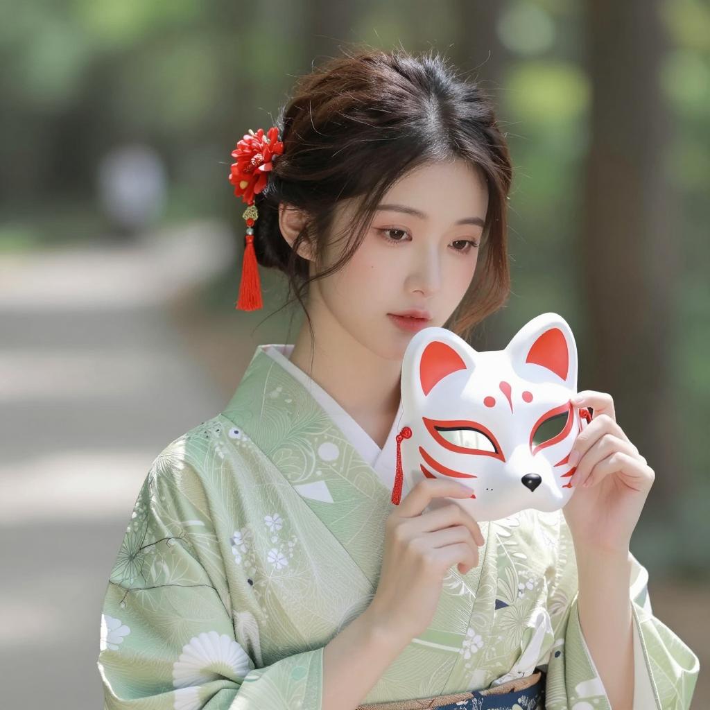 East Asian woman in a dark green floral kimono with pink flowers, red obi, and gold accents, standing on a dimly lit street at night. Long brown hair in a side bun. Street lamps in the background. She looks to the left with a serious expression. Nighttime urban setting. Digital illustration style.