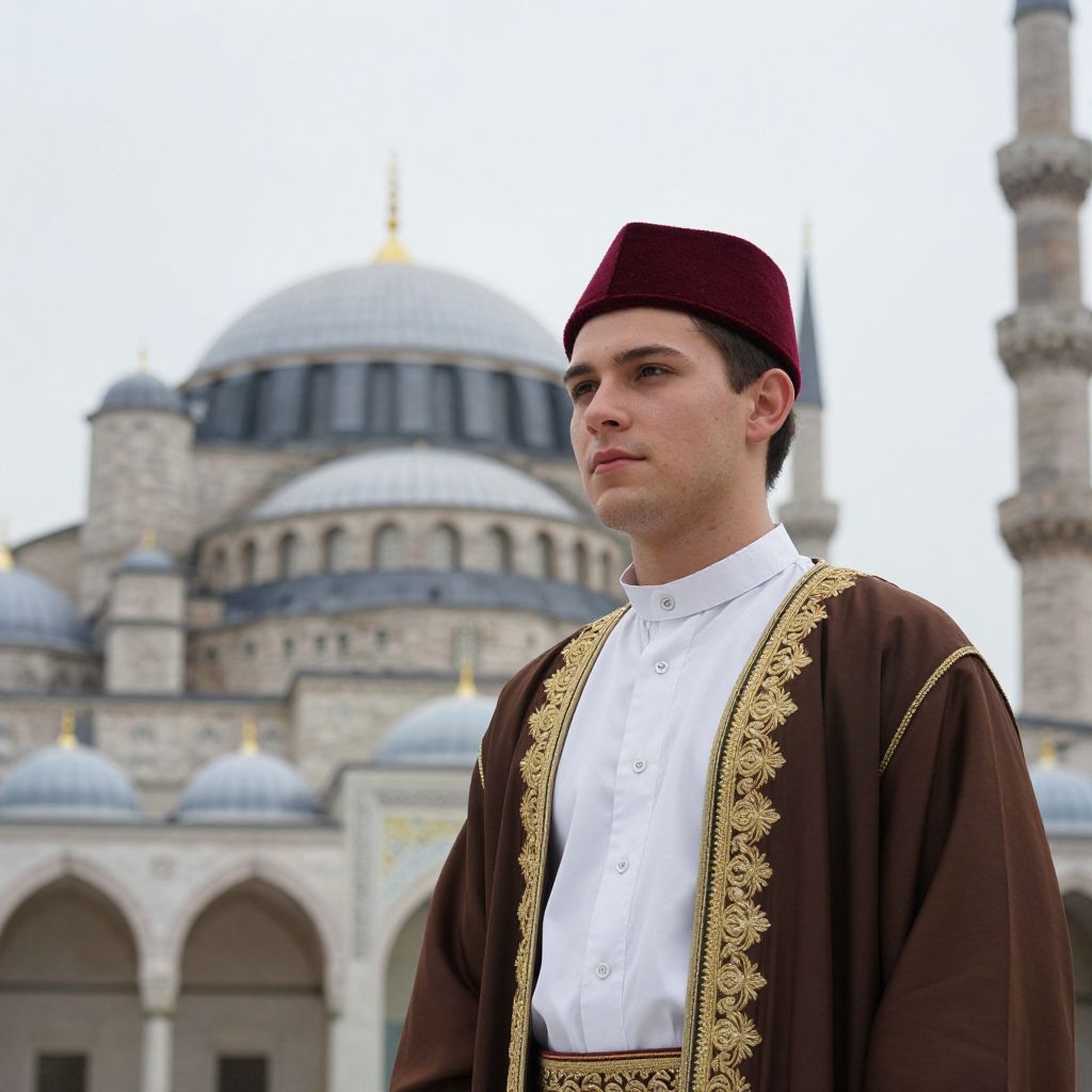 Photograph of a young man with fair skin and short dark hair, wearing a deep red fez and an ornate brown robe with gold embroidery over a white shirt. He stands in front of a grand, historic mosque with multiple domes and minarets. The background is slightly blurred, focusing attention on the man. The sky is overcast, giving a soft light to the scene.