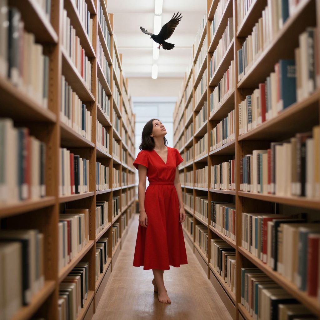 Photograph of a woman in a red dress, barefoot, standing between tall library shelves, with a black bird flying above her.