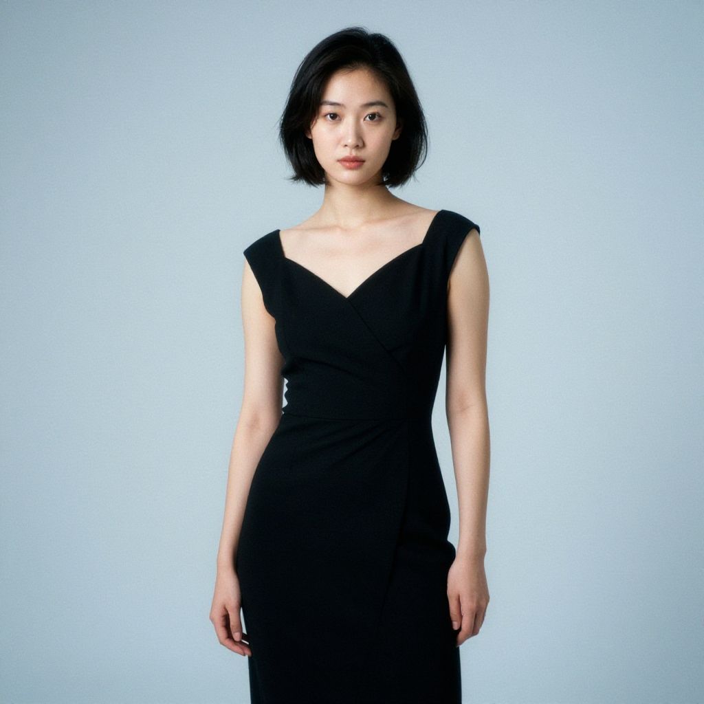 Photograph of an East Asian woman with long black hair standing against a plain gray background. She wears a long-sleeved, button-up black blouse and a matching black maxi skirt that reaches the floor. Her feet are in black open-toed sandals. She has a neutral expression and stands with her arms relaxed by her sides. The lighting is even, highlighting her slender physique and the simplicity of her outfit. The overall style is minimalist and elegant.
