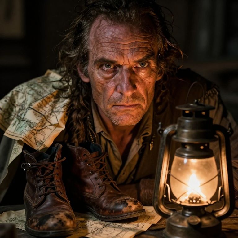 Photograph of a rugged, middle-aged man with long, disheveled brown hair and a weathered face, illuminated by a warm, glowing lantern on a wooden table. He has a serious, intense expression, with visible wrinkles and a slight beard. He is wearing a dirty, brown leather vest over a beige shirt, with worn, brown lace-up boots in the foreground. The background is dark and blurry, emphasizing the lantern's light. The scene has a dramatic, almost cinematic quality, with rich, moody colors and strong contrasts.